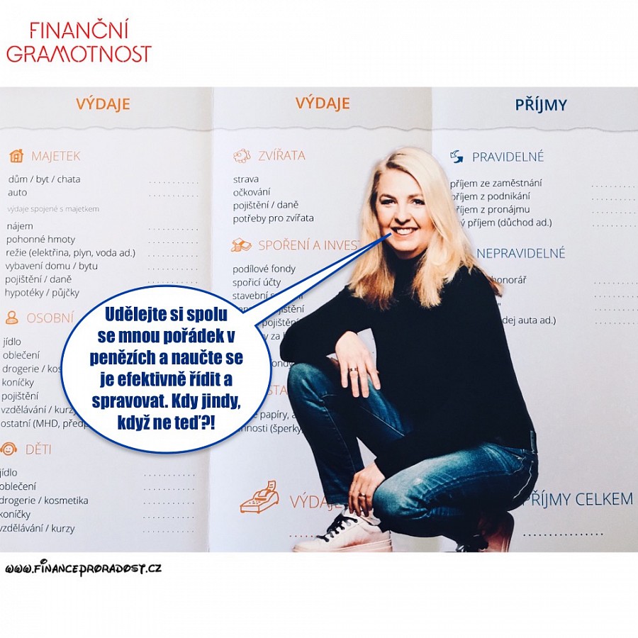 Dejte si již nyní finance do pořádku a naučte se spolu se mnou efektivnímu řízení a jednoduché správě peněz, která vám pomůže vidět vaše finance z ptačí perspektivy, a daleko lépe najít skryté rezervy i zloděje peněz.