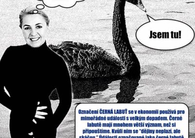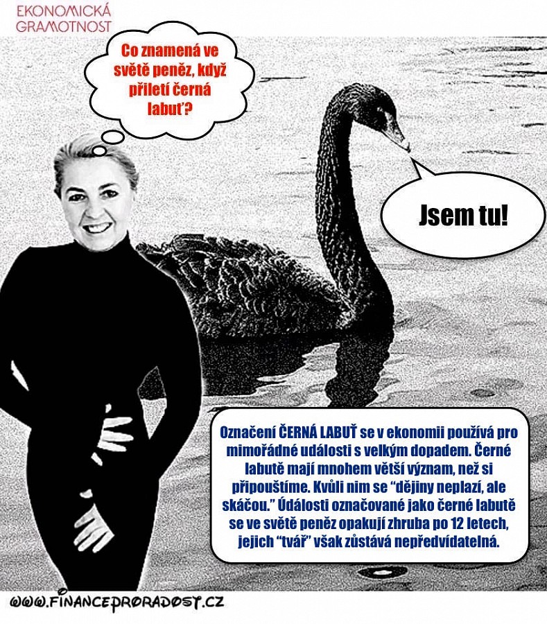 - Označení ČERNÁ LABUŤ se v ekonomii používá pro mimořádné události s velkým dopadem. Černé labutě mají mnohem větší význam, než si připouštíme. Kvůli nim se „dějiny neplazí, ale skáčou.“ Události označované jako černé labutě se ve světě peněz opakují zhruba po 12 letech, jejich „tvář“ však zůstává nepředvídatelná.
