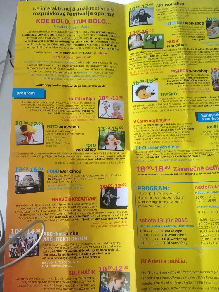 Nejinteraktivnější a nejkreativnější festival „KDE BOLO, TAM BOLO…“ (nejen) pro děti se letos uskutečnil ve dnech 13.-14.6.2015 v Bratislavě (Slovensko). Kuřátko Pípo mělo pro děti a jejich rodiče připraven workshop finanční gramotnosti na téma BOHATSTVÍ. Atmosféra nádvoří Staré radnice v centru města byla úžasná a ikdyž jsme festival zahajovali a sluníčko peklo už od brzkých ranních hodin, účast na našem workshopu byla zcela zaplněna – což nás velmi potěšilo :-)).