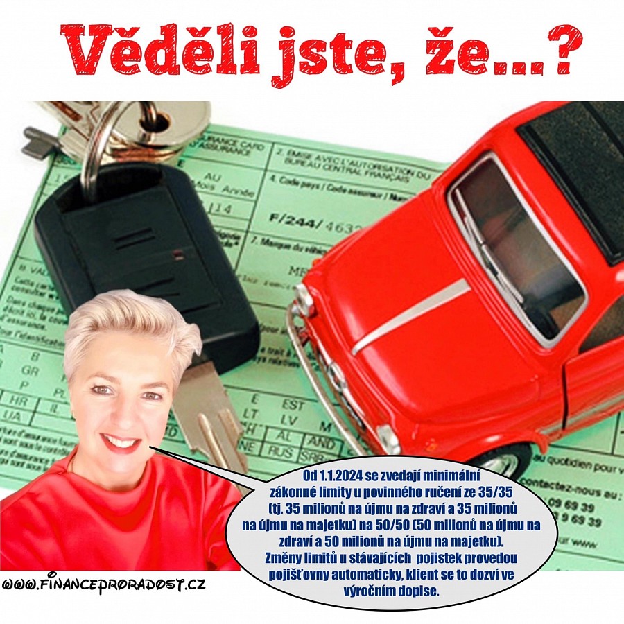 12.Věděli jste, že … Co nového se děje v oblasti pojištění majetku? Od 1.1.2024 se chystá změna minimálních limitů u povinného ručení tj. zákonného pojištění vozu. A proč? S rostoucími cenami, rostou i náklady na škody a při stávajících limitech bychom nebyli dostatečně chráněni, když bychom způsobili na silnici nějakou havárku. (viz. obrázek v příloze)