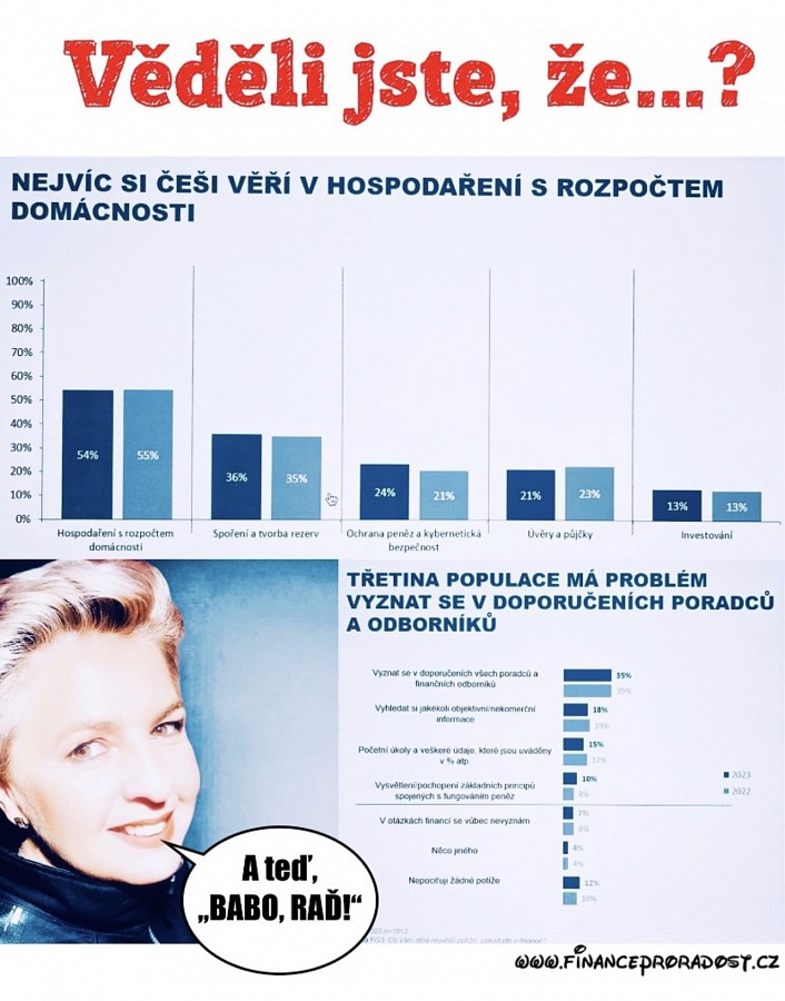 5. Věděli jste, že…. Češi patří v Evropě stále mezi největší finanční negramoty? A čemu vlastně rozumíme a kde jsme úplně nekovaní? Na druhou stranu je třeba přiznat, že v Čechách chybí kvalitní finanční vzdělávání, finanční sektor to nenahradí. Na kolik Češi rozumí lidem, kteří se jim ve financích snaží poradit? (viz. obrázek v příloze)