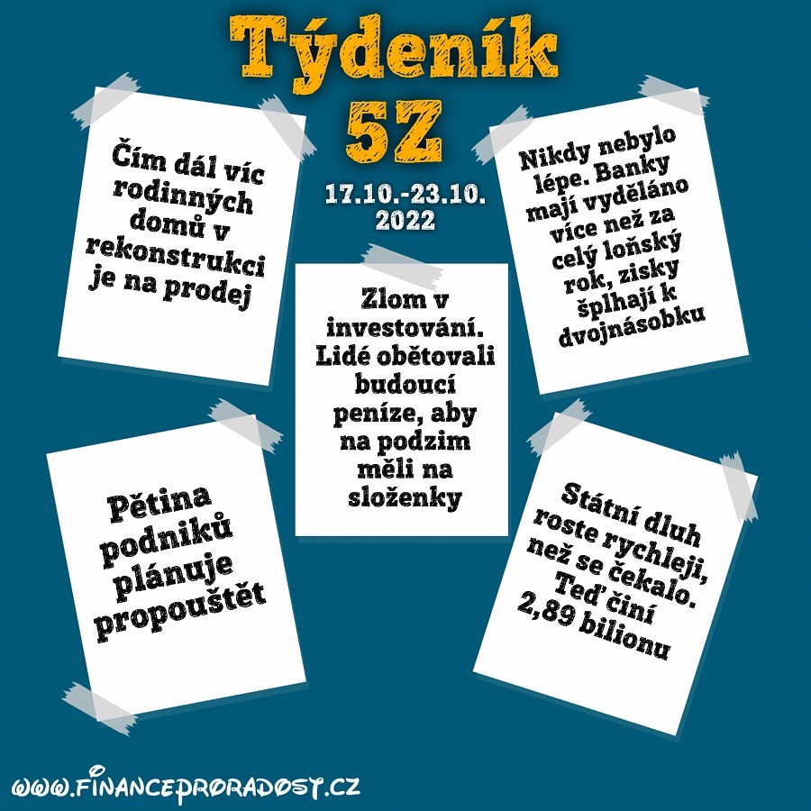 Týdeník 5Z: Pět zajímavostí z české ekonomiky, které se staly v tomto týdnu (17.10.-23.10.2022), a neměli bychom je přehlédnout.
