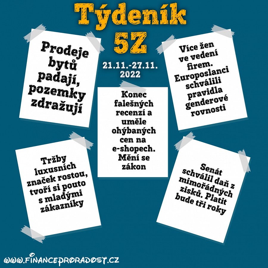 Týdeník 5Z: Pět zajímavostí z české ekonomiky, které se staly v tomto týdnu (21.11.-27.11.2022), a neměli bychom je přehlédnout.