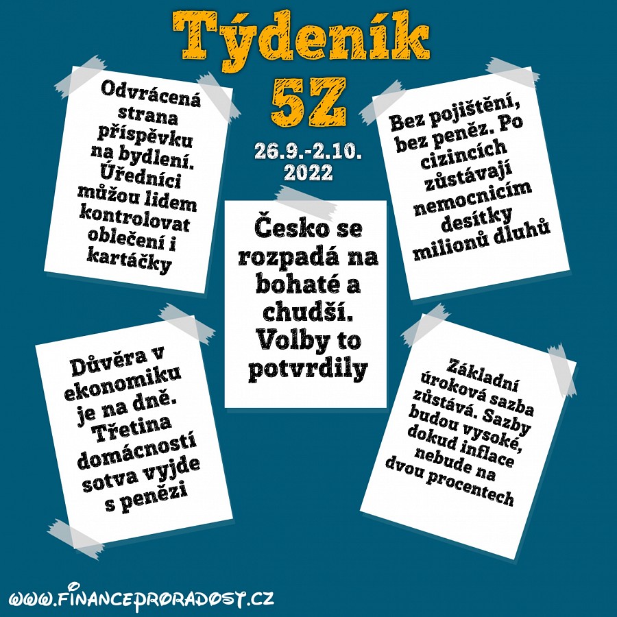 Týdeník 5Z: Pět zajímavostí z české ekonomiky, které se staly v tomto týdnu (26.9.-2.10.2022), a neměli bychom je přehlédnout.
